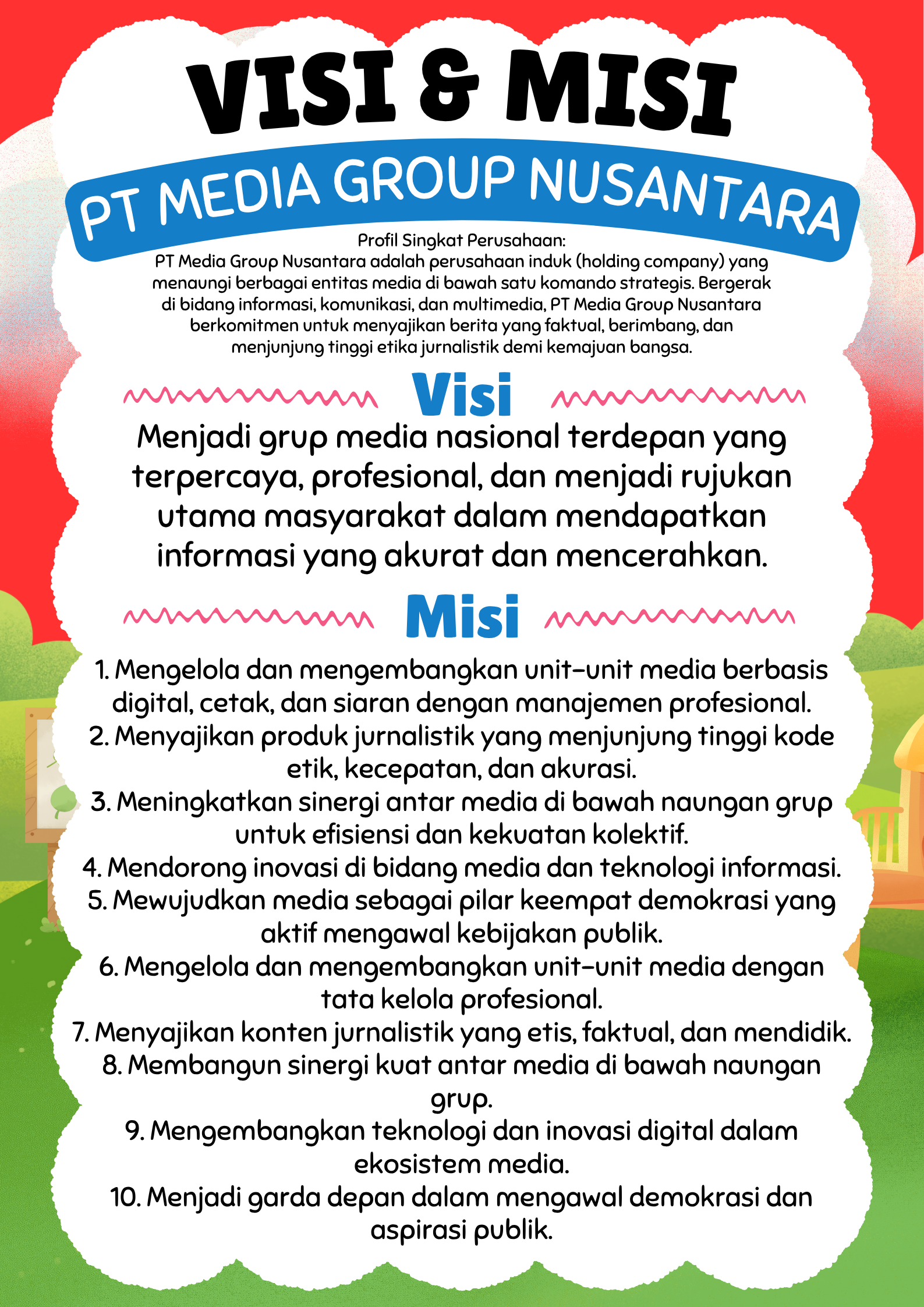 PT Media Group Nusantara merupakan perusahaan induk (holding company) yang bergerak di bidang media, informasi, komunikasi, dan multimedia. Perusahaan ini menaungi dan mengelola berbagai platform media cetak, media online, penyiaran digital, serta produksi konten multimedia yang berorientasi pada kualitas, integritas, dan profesionalisme.