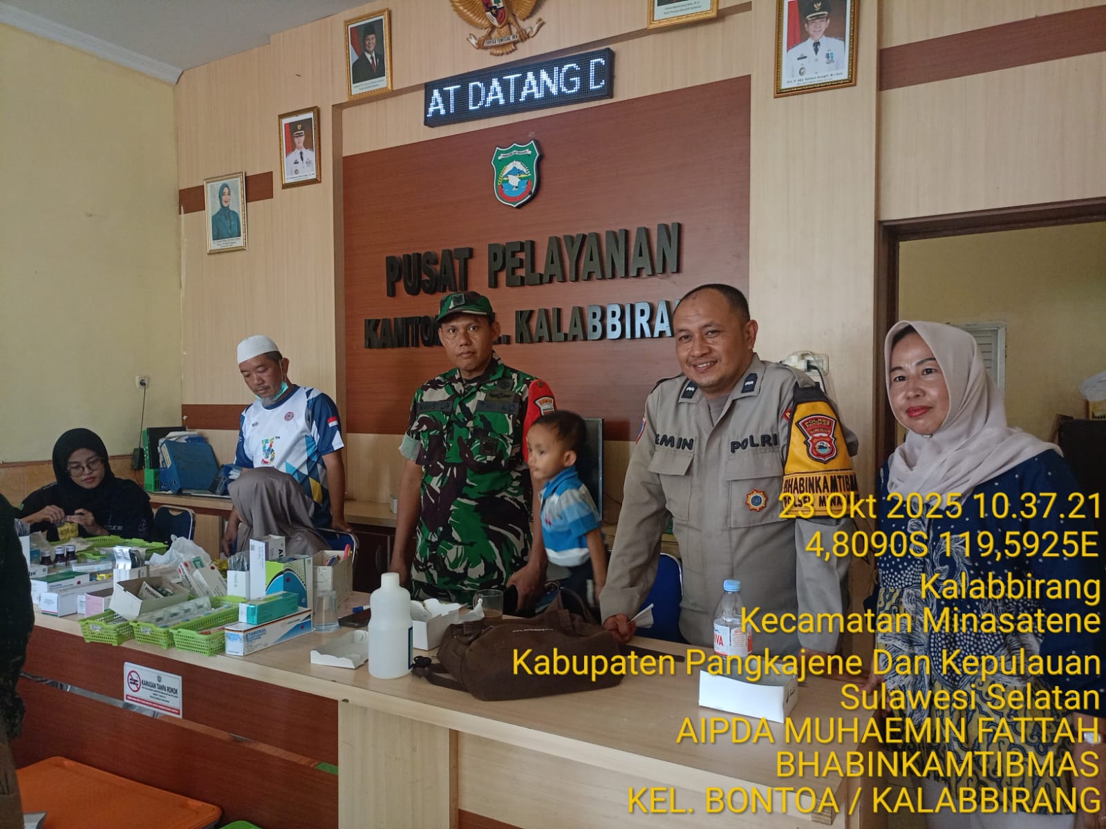 Kalabbirang, Minasatene – Dalam rangka HUT PT. Semen Tonasa ke -57, Bhabinkamtibmas Kalabbirang Aipda Muhaemin Fattah, melaksanakan pengamanan dan monitoring pada kegiatan pemeriksaan kesehatan gratis yang digelar di Kantor Lurah Kalabbirang, Kamis (23/10/2025).