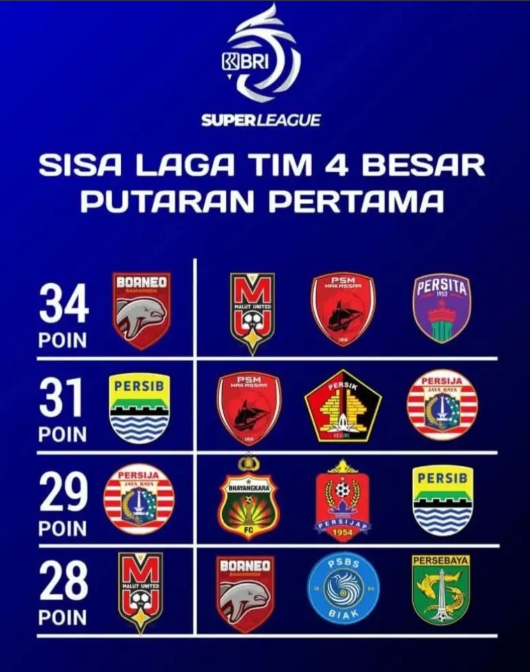 Empat tim teratas saat ini ditempati oleh Borneo FC dengan 34 poin, disusul Persib Bandung 31 poin, Persija Jakarta 29 poin, dan Malut United di posisi keempat dengan 28 poin. Kondisi ini membuat setiap pertandingan ke depan menjadi sangat krusial bagi seluruh tim papan atas.