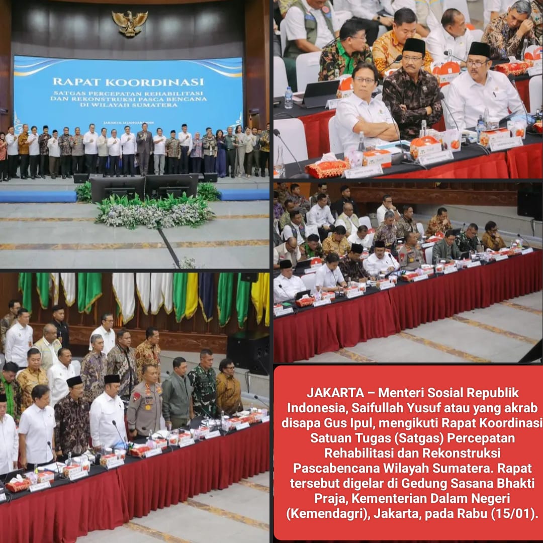JAKARTA – Menteri Sosial Republik Indonesia, Saifullah Yusuf atau yang akrab disapa Gus Ipul, mengikuti Rapat Koordinasi Satuan Tugas (Satgas) Percepatan Rehabilitasi dan Rekonstruksi Pascabencana Wilayah Sumatera. Rapat tersebut digelar di Gedung Sasana Bhakti Praja, Kementerian Dalam Negeri (Kemendagri), Jakarta, pada Rabu (15/01).