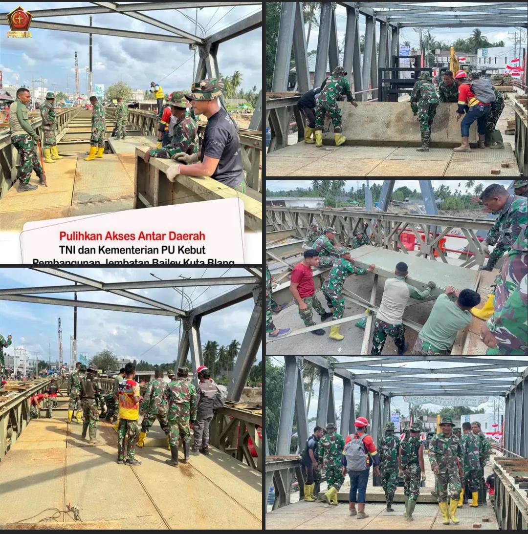 Pembangunan Jembatan Bailey Kuta Blang yang menghubungkan Kabupaten Bireuen dengan Kabupaten Aceh Utara di Kecamatan Krueng Tikeum, Bireuen, terus dikebut pengerjaannya oleh prajurit Kodam Iskandar Muda dalam kolaborasi dengan Kementerian Pekerjaan Umum (PU) yang tergabung dalam Satgas Penanggulangan Bencana Alam. Hingga Rabu (24/12/2025), progres pembangunan telah mencapai sekitar 80 persen.