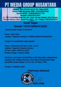 Amanah besar ini diberikan langsung oleh Direktur Utama PT Media Group Nusantara, Rusli S. Yusup, yang berkedudukan di Kantor Pusat Ternate, Maluku Utara, Jl. FITU, Desa/Kelurahan Fitu, Kec. Kota Ternate Selatan, Kota Ternate, Provinsi Maluku Utara, melalui surat mandat resmi No. 001/MGN-PUSAT/X/2025 kepada Muhammad Ali Sakti A.Md., C.LA-D (Kanda Ali).