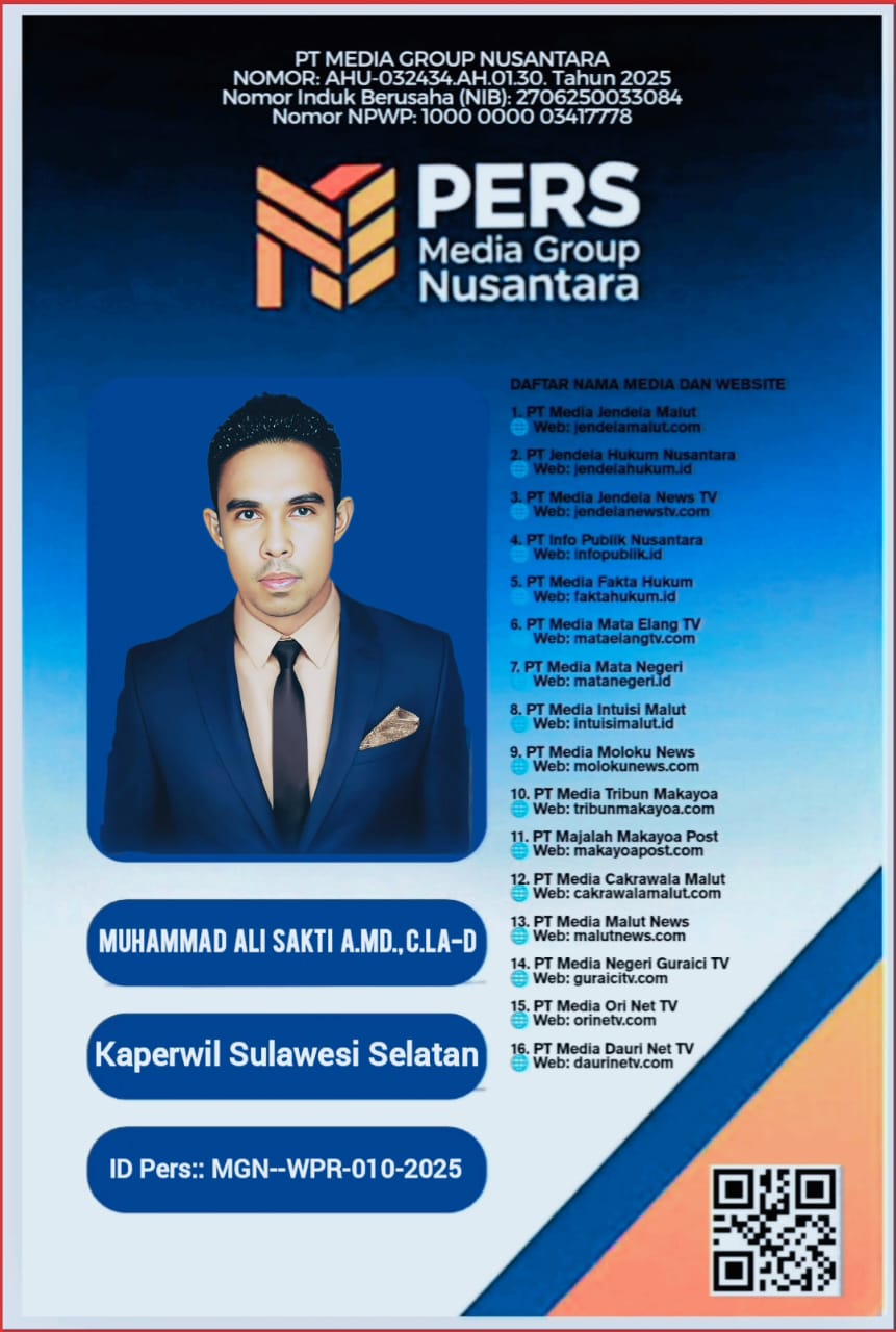 Amanah besar ini diberikan langsung oleh Direktur Utama PT Media Group Nusantara, Rusli S. Yusup, yang berkedudukan di Kantor Pusat Ternate, Maluku Utara, Jl. FITU, Desa/Kelurahan Fitu, Kec. Kota Ternate Selatan, Kota Ternate, Provinsi Maluku Utara, melalui surat mandat resmi No. 001/MGN-PUSAT/X/2025 kepada Muhammad Ali Sakti A.Md., C.LA-D (Kanda Ali).