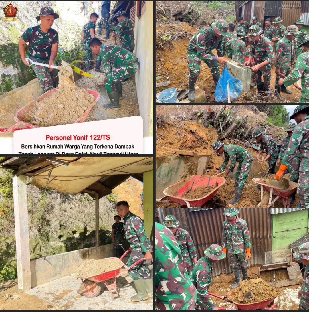 Satgas Gulbencal Yonif 122/TS Gotong Royong Bersihkan Rumah Warga Terdampak Longsor di Tapanuli Utara